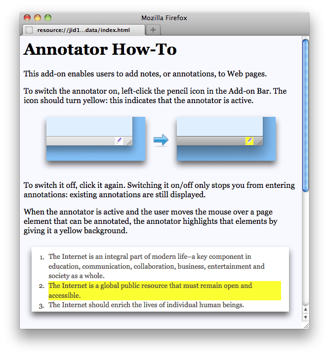 For pages like this, navigational elements such as the Awesome Bar, Search Bar, or Bookmarks Toolbar are not usually relevant and distract from the content you are presenting. The addon-page module provides a simple way to have a page which excludes these elements.
