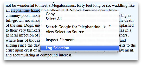 Click it, and the selection is logged to the console (or the shell, if you're running an instance of Firefox from the command line):