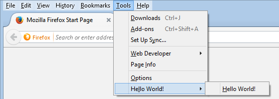 <menupopup id="menu_ToolsPopup"> <menu id="xulschoolhello-hello-menu" label="&xulschoolhello.hello.label;" accesskey="&xulschoolhello.helloMenu.accesskey;" insertbefore="devToolsEndSeparator"> <menupopup> <menuitem id="xulschoolhello-hello-menu-item" label="&xulschoolhello.hello.label;" accesskey="&xulschoolhello.helloItem.accesskey;" oncommand="XULSchoolChrome.BrowserOverlay.sayHello(event);" /> </menupopup> </menu> </menupopup>