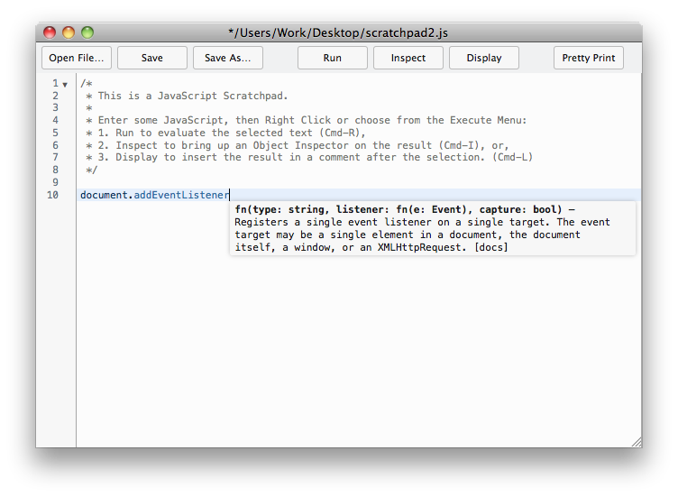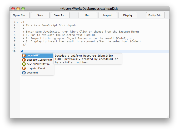 Scratchpad integrates the tern code analysis engine, and uses that to provide autocomplete suggestions and popups containing information on the current symbol. To list autocomplete suggestions, press Ctrl + Space.