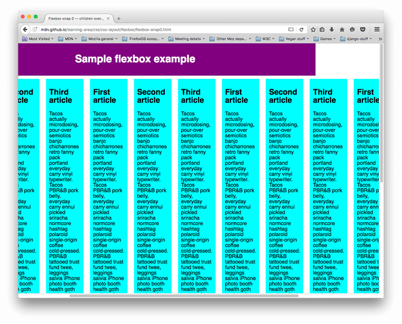 One issue that arises when you have a fixed amount of width or height in your layout is that eventually your flexbox children will overflow their container, breaking the layout. Have a look at our flexbox-wrap0.html example, and try viewing it live (take a local copy of this file now if you want to follow along with this example):