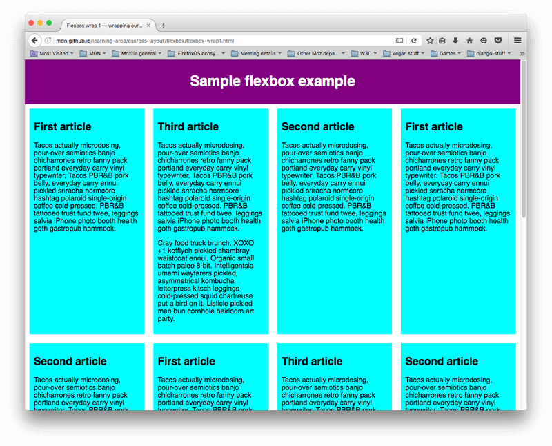 We now have multiple rows — as many flexbox children are fitted onto each row as makes sense, and any overflow is moved down to the next line. The flex: 200px declaration set on the articles means that each will be at least 200px wide; we'll discuss this property in more detail later on. You might also notice that the last few children on the last row are each made wider so that the entire row is still filled.