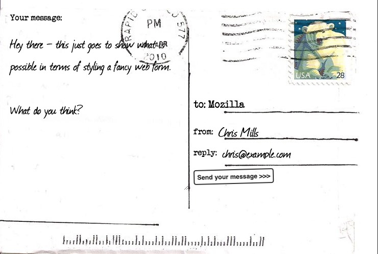 Let's look at a concrete example of how to style an HTML form. We will build a fancy-looking "postcard" contact form; see here for the finished version.