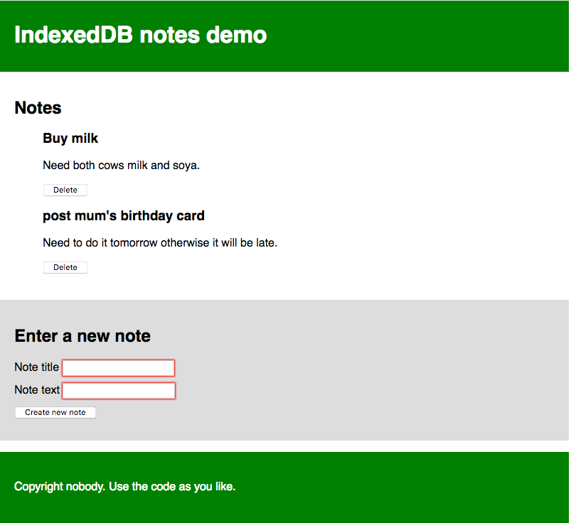 Here we'll run you through an example that allows you to store notes in your browser and view and delete them whenever you like, getting you to build it up for yourself and explaining the most fundamental parts of IDB as we go along.