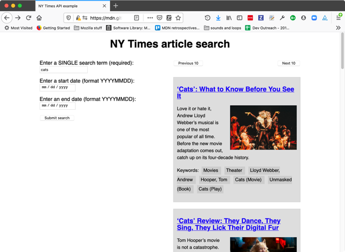 submitSearch()andfetchResults()function definitions, below the previous line:function submitSearch(e) { pageNumber = 0; fetchResults(e); } function fetchResults(e) { // Use preventDefault() to stop the form submitting e.preventDefault(); // Assemble the full URL url = baseURL + '?api-key=' + key + '&page=' + pageNumber + '&q=' + searchTerm.value + '&fq=document_type:("article")'; if(startDate.value !== '') { url += '&begin_date=' + startDate.value; }; if(endDate.value !== '') { url += '&end_date=' + endDate.value; }; }