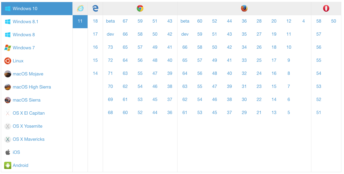 - Choose the browser/OS combination you want to test by selecting the combination in the grid.