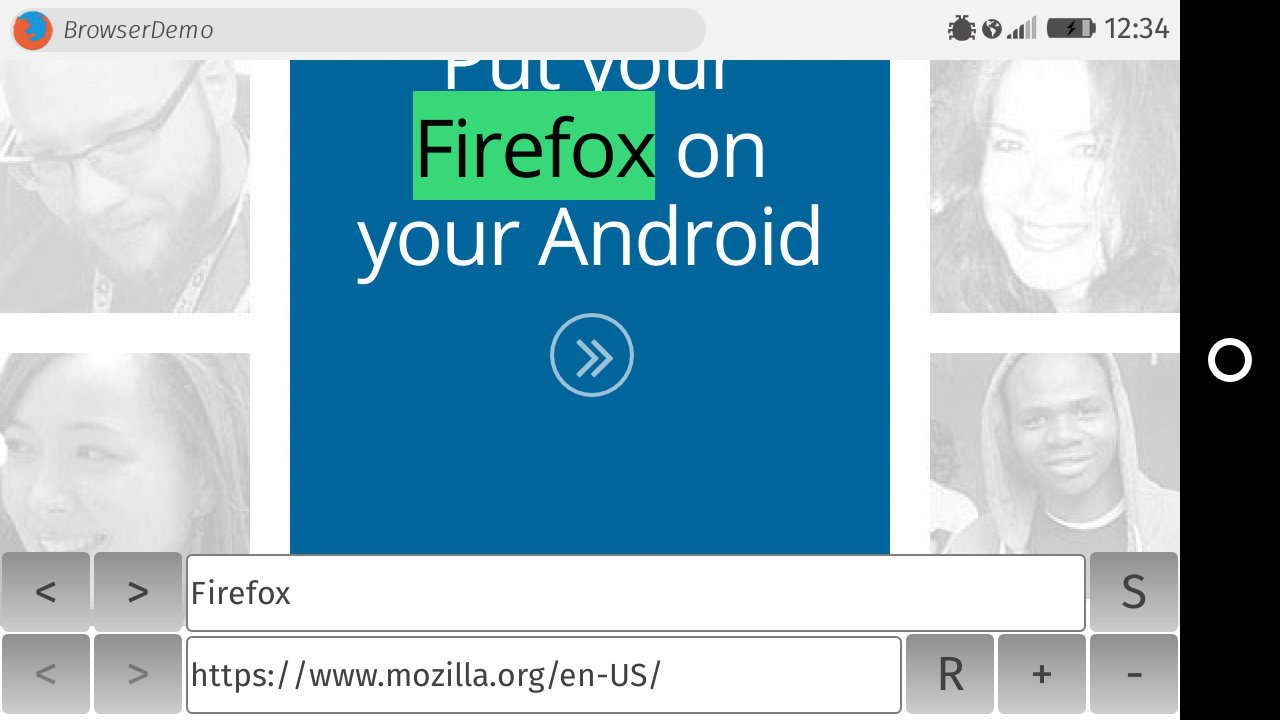 Let's now turn our attention to implementing browser search using the Browser API. Tap the "S" button and try it out. Try searching for "Firefox" on the default page when the app first loads.