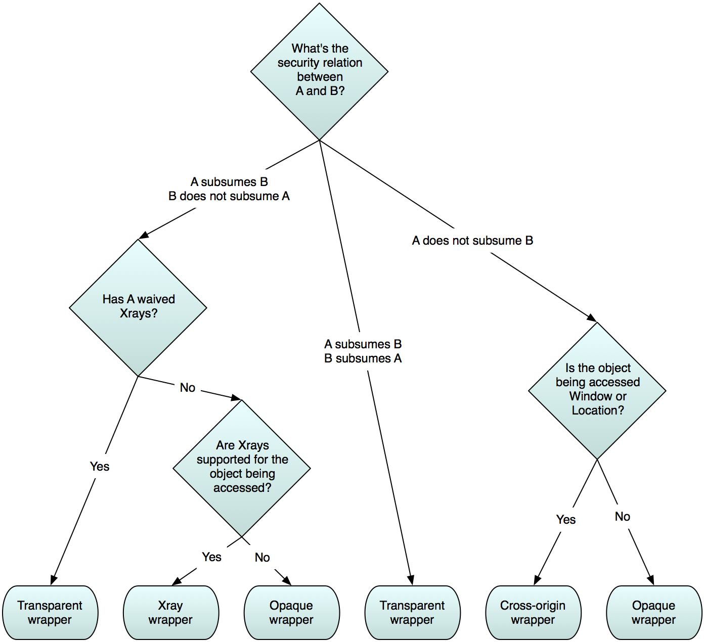 The following diagram shows the factors that determine the kind of wrapper that compartment A would get when trying to access an object in compartment B.