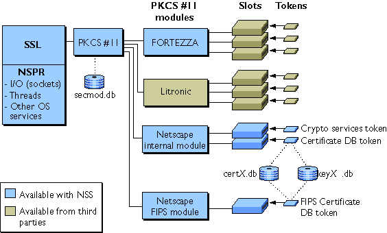 Figure 2.1 illustrates the relationships between NSPR, SSL, PKCS #11, and the available cryptographic modules. SSL is built on top of NSPR, which handles sockets, threads, and related low-level OS operations. On any given server or client, one or more PKCS #11 modules may be available.