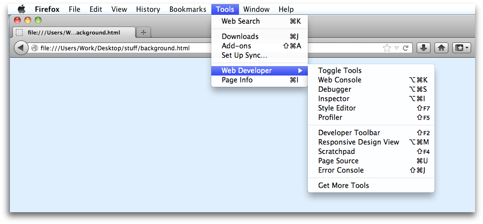 The Web Developer menu is the main way to access the developer tools that are built into Firefox. On OS X and Linux, it's under the "Tools" menu:
