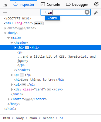 To start searching the markup, click in the search box to expand it or press Ctrl + F , or Cmd + F on a Mac. There are three types of searches that are performed automatically depending on what you enter, a full text search, a CSS selector search, and an XPath search.