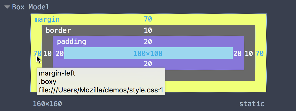 If you hover over part of the box model in the Box Model view, the corresponding part of the page is highlighted: