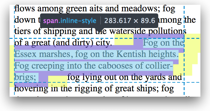 If the element is inline and is split over multiple line boxes, the highlighter shows each individual line box that together make up the element: