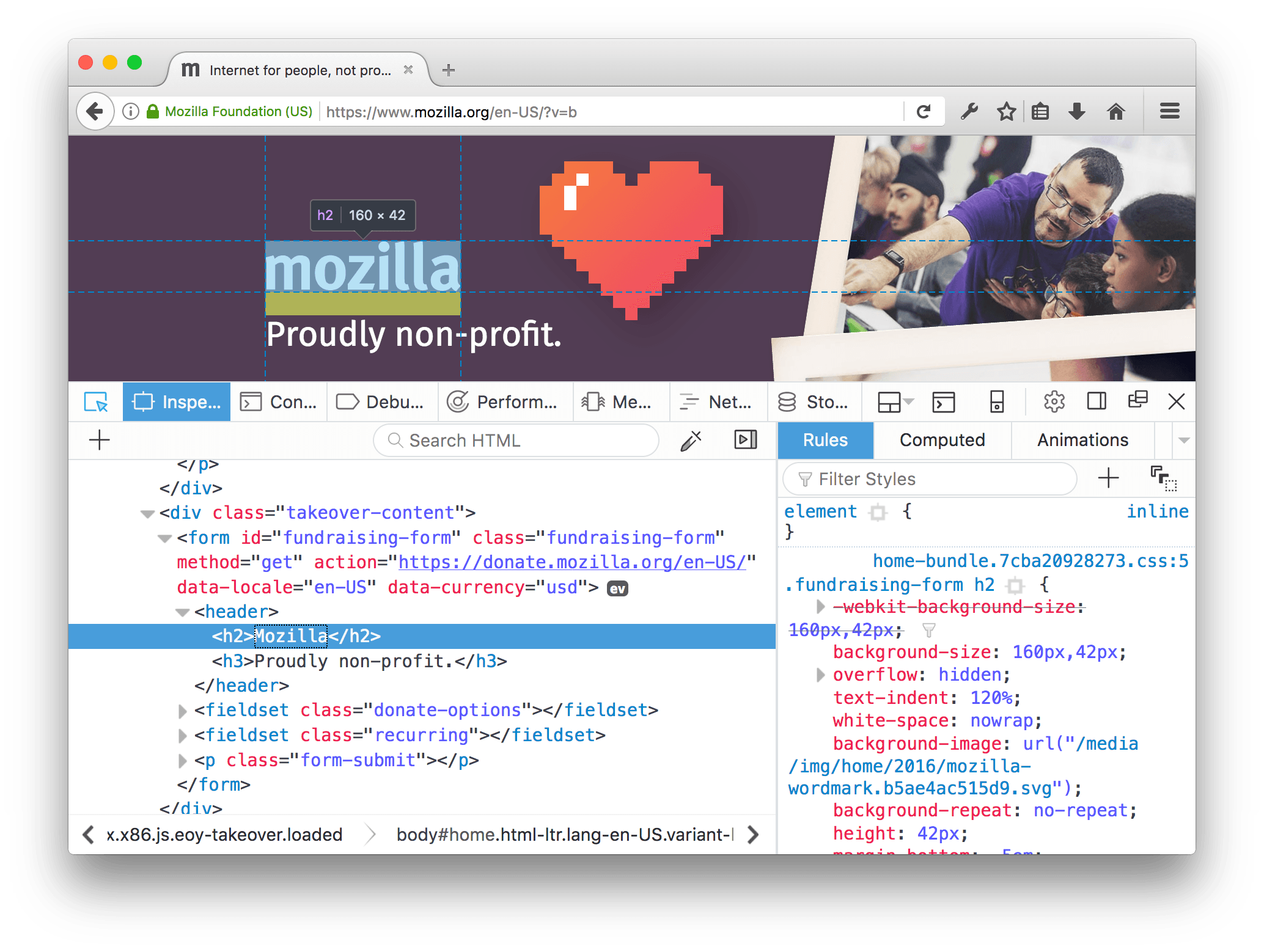 When the inspector is open, as you move the mouse around the elements listed in the HTML pane, the corresponding elements are highlighted in the page. Click an element in the HTML pane to select it: