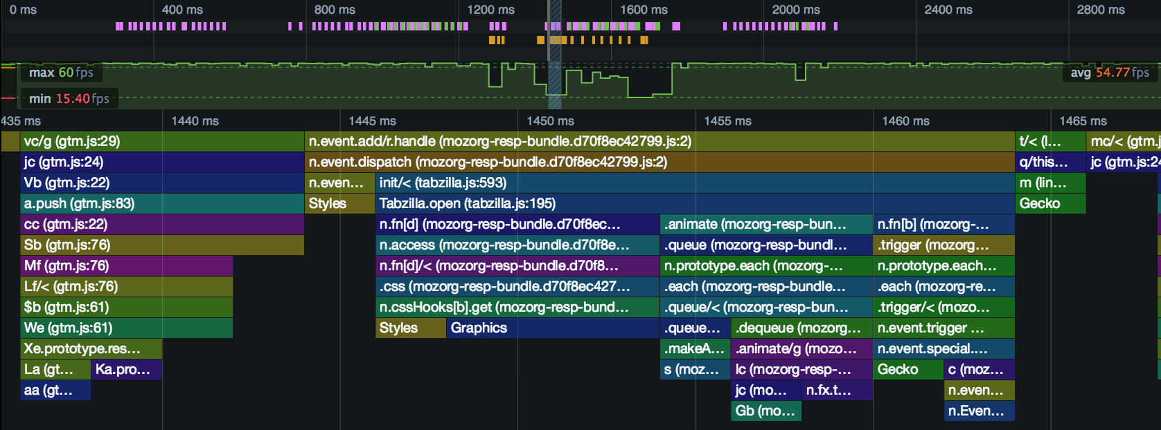 In the Flame Chart view itself, along the X-axis is time. The screenshot above covers the period from 1435ms to a little past 1465ms. Along the Y-axis are the functions on the call stack at that point in time, with the top-level at the top, and the leaf function at the bottom. Functions are color-coded to make them easier to distinguish.