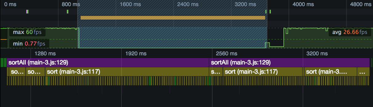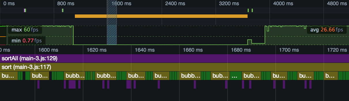 The markers labeled "bubb..." and colored olive-green are presumably bubbleSort(). The ones colored plain green are presumably the other sort functions. Even at a glance, we can see that the bubble sort blocks are much wider (of a longer duration) than the others.