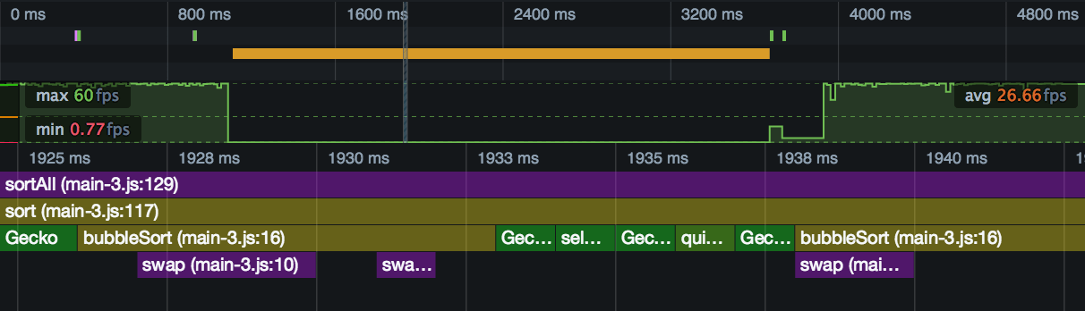 We can also see that two of the green markers are for selectionSort() and quickSort(), but we're also seeing calls to platform (Gecko) code in between our calls to the sorting functions. It seems very likely that this is from the console.log() calls in sort().