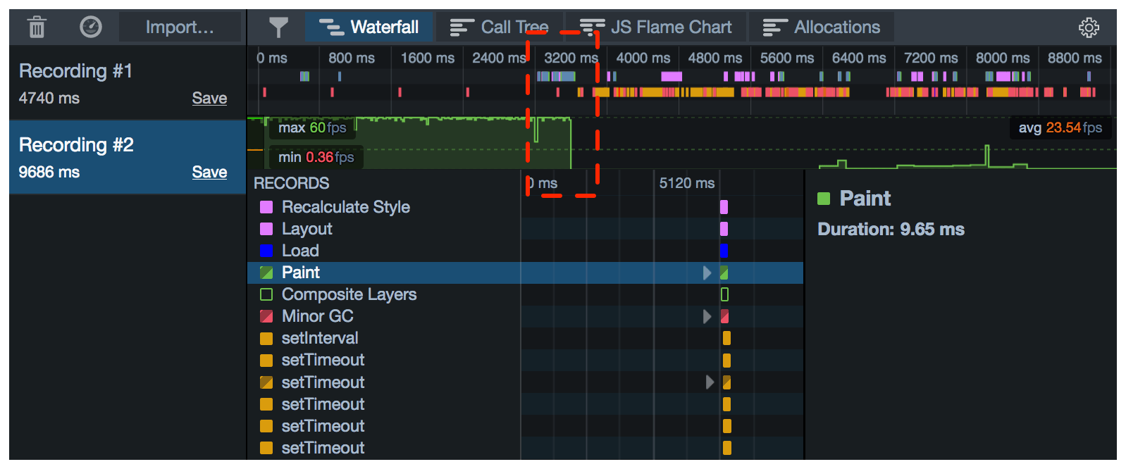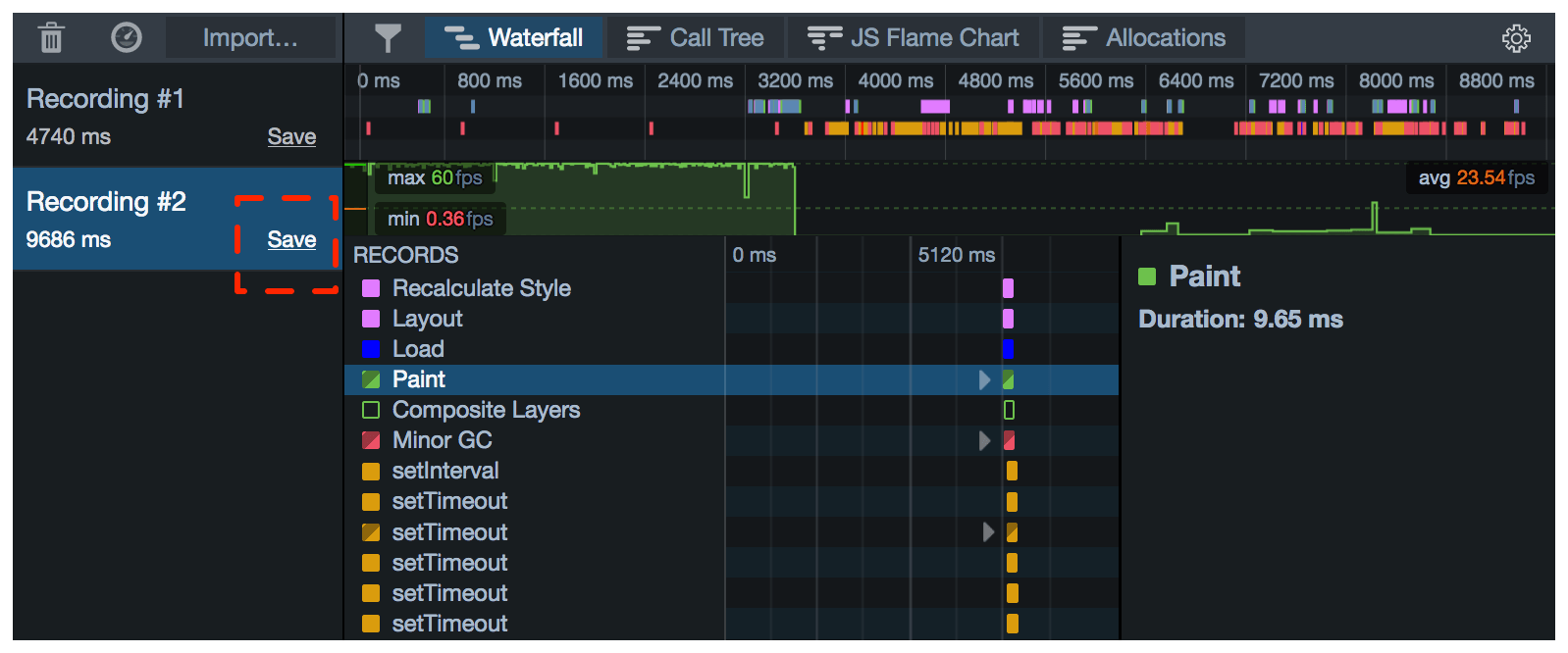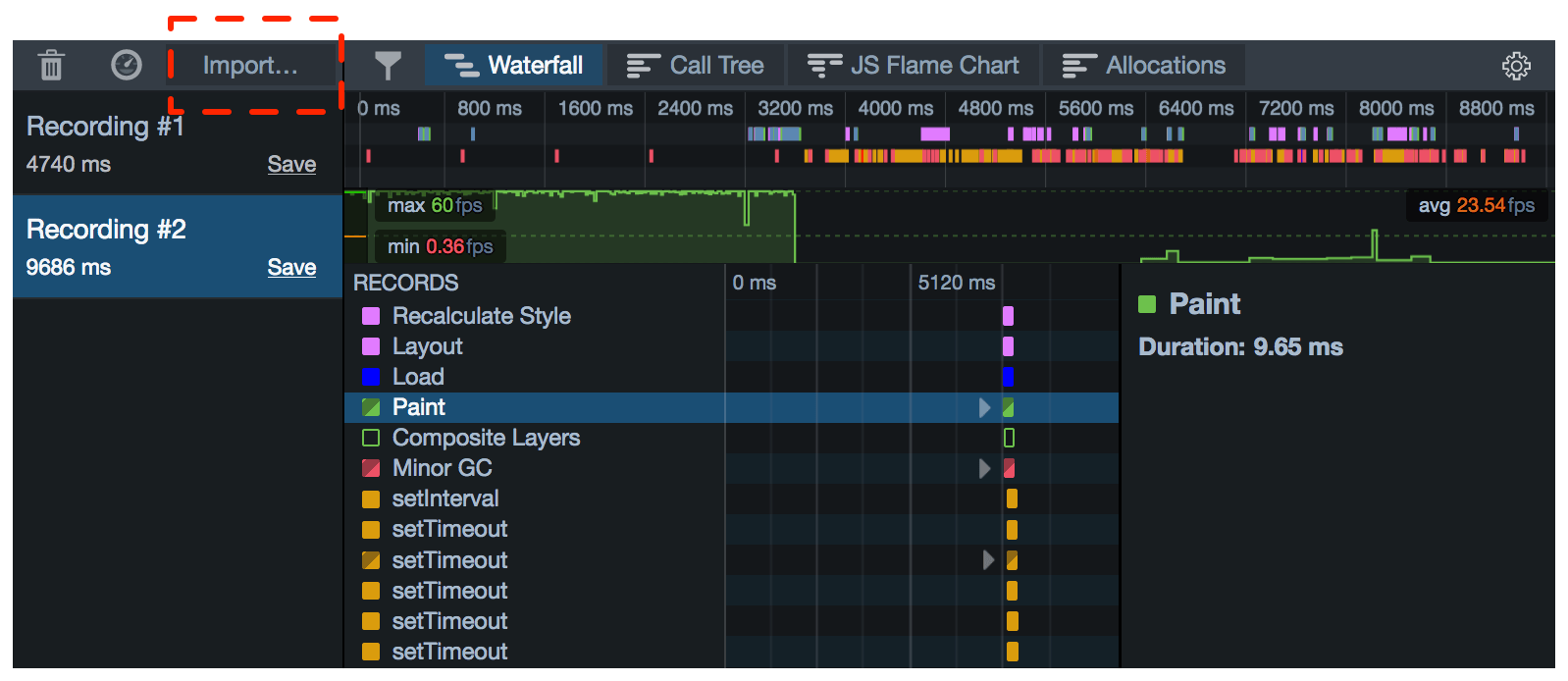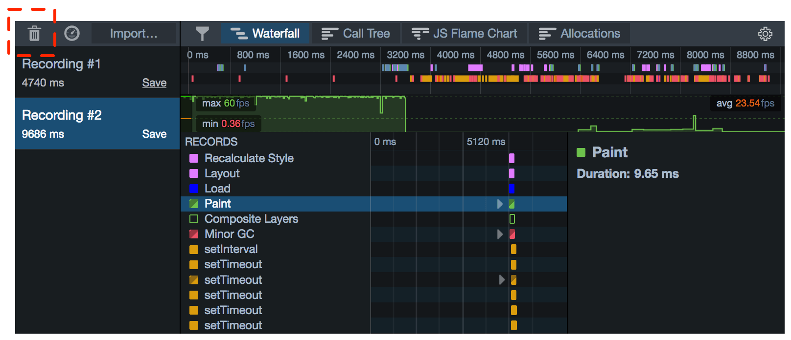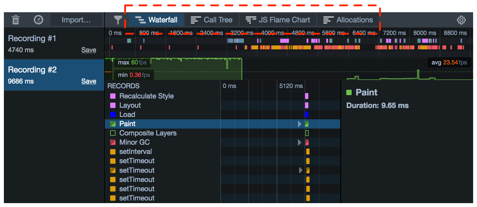 To switch between the Waterfall, Call Tree, and Flame Chart tools, use the buttons in the toolbar: