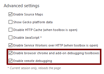 Note: By default, and for security reasons, the devtools.debugger.force-local option is set. If you want to debug a Firefox instance from an external machine, you can change this option, but only do this on a trusted network or set a strong firewall rule to lock down which machines can access it.