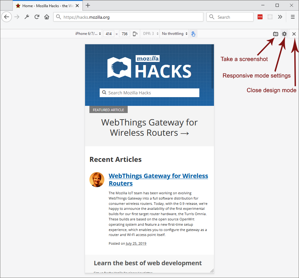 - From the Firefox menu: Select Responsive Design Mode from the Web Developer submenu in the Firefox Menu (or Tools menu if you display the menu bar or are on macOS).