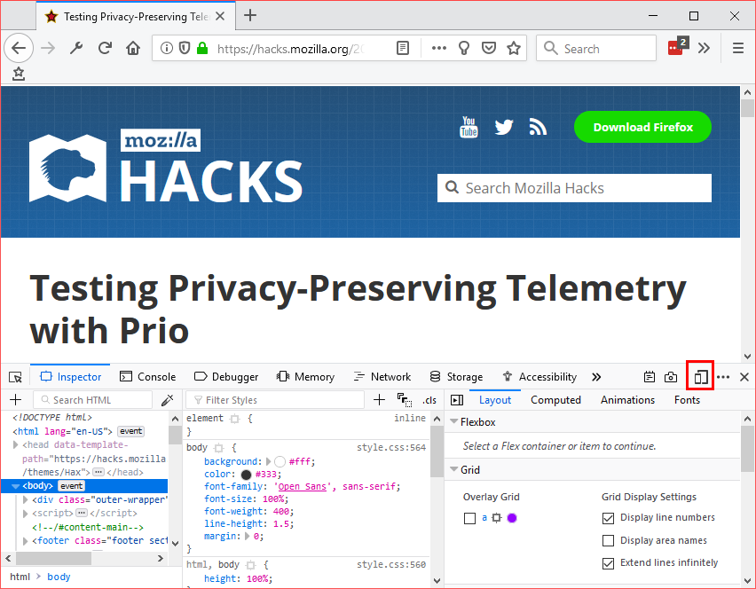 - From the Developer Tools toolbox: Press the Responsive Design Mode button in the Toolbox's toolbar: