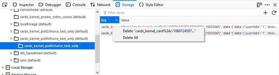 Note: The data shown in an IndexedDB database is a snapshot of the data as it was when you opened the Storage Inspector tool.