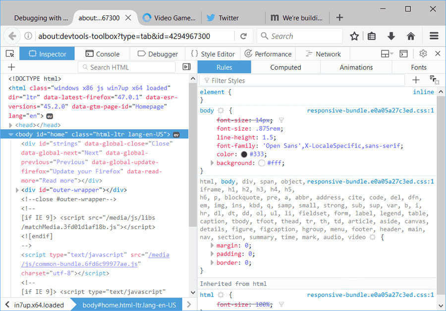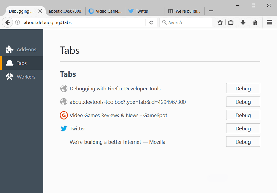 Note that this feature isn't that immediately useful to debugging desktop tabs — you can open up a toolbox to debug a tab easily enough already — but this will become far more useful when about:debugging starts to support remote debugging, and this page can begin to list tabs available for debugging on mobile device browsers, simulators, etc. See bug 1212802 for the latest on this work.
