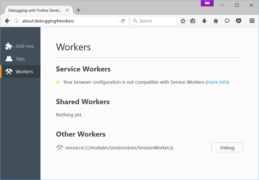 In Firefox 49+, a warning message will be displayed in the Service Workers section of the Workers page if service workers are incompatible with the current browser configuration, and therefore cannot be used or debugged.