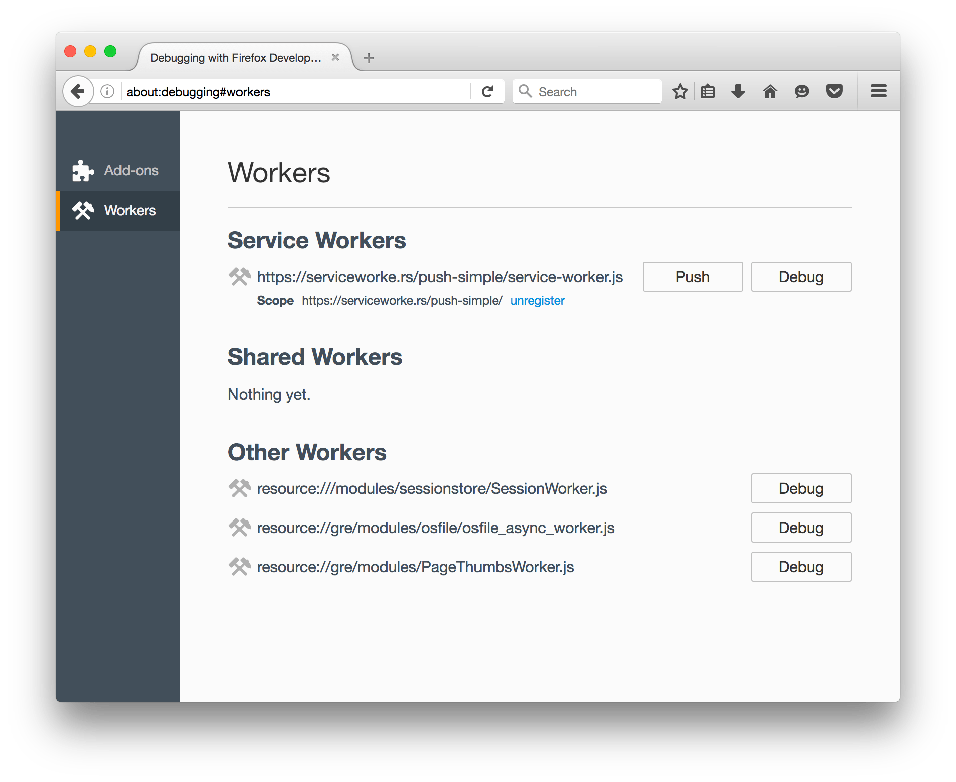 When about:debugging opens, on the left-hand side, you'll see a sidebar enabling you to switch between the two main views: one for add-ons and one for workers.