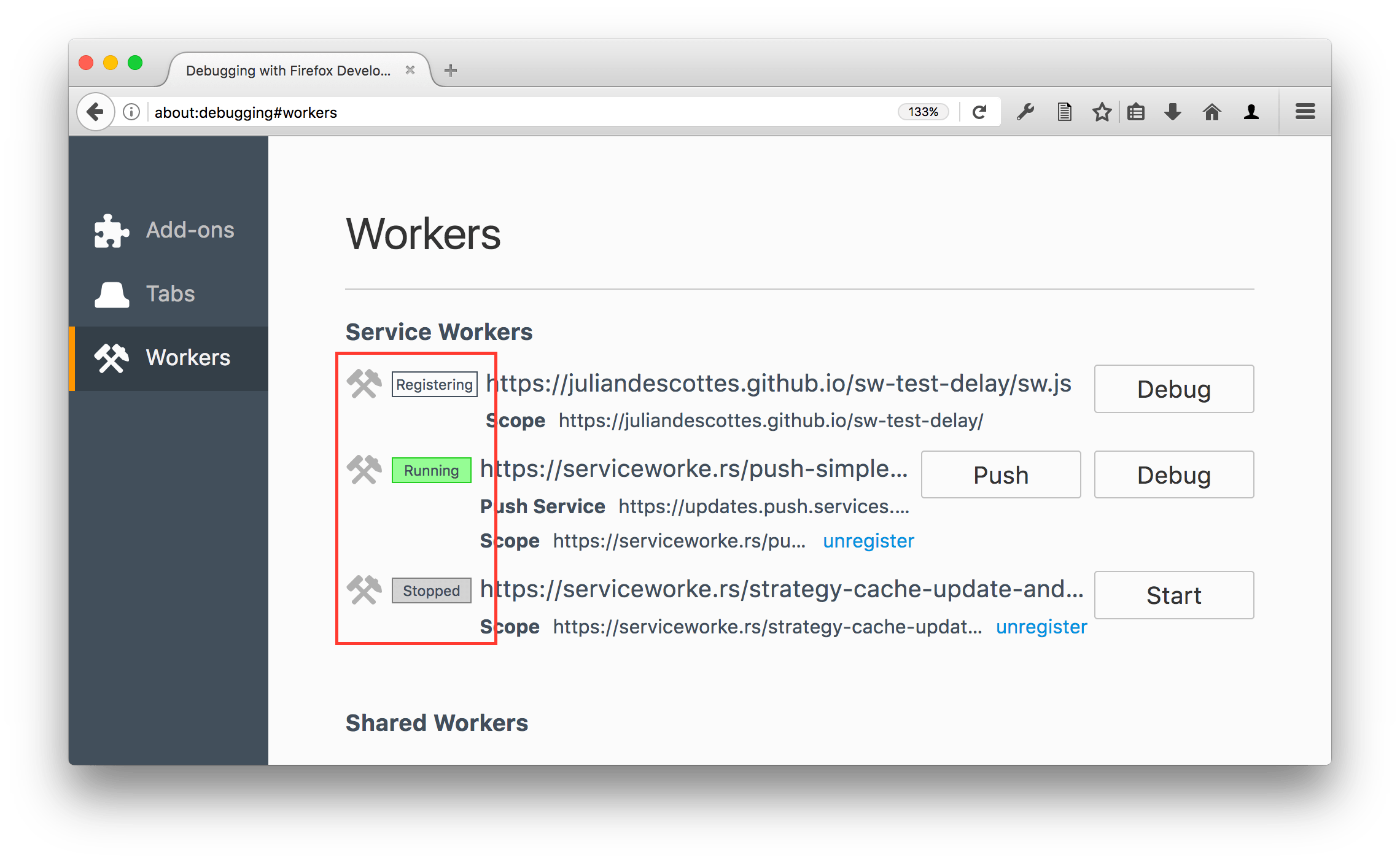 At first, you won't see any workers listed under Service Workers or Shared Workers. As soon as a worker is registered, the listing is updated:
