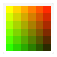 In this example, we use two for loops to draw a grid of rectangles, each having a different fill color. To achieve this, we use the two variables i and j to generate a unique RGB color for each square, and only modify the red and green values. (The blue channel has a fixed value.) By modifying the channels, you can generate all kinds of palettes.