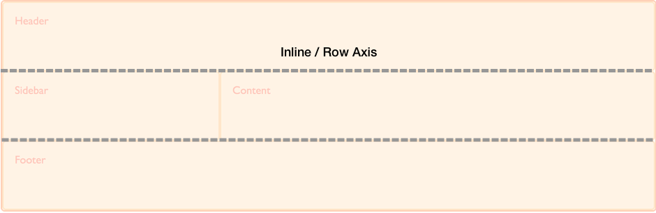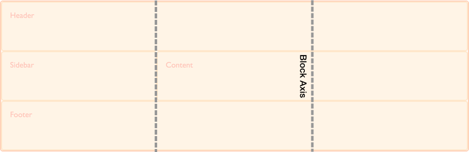 When working with grid layout you have two axes available to align things against – the block axis and the inline axis. The block axis is the axis upon which blocks are laid out in block layout. If you have two paragraphs on your page they display one below the other, so it is this direction we describe as the block axis.