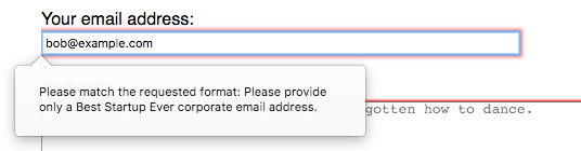 That's why, instead, we specify the string "Please provide only a Best Startup Ever corporate e-mail address" By doing that, the resulting full error message might be something like "The entered text doesn't match the required pattern. Please provide only a Best Startup Ever corporate e-mail address."