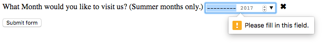 If you try to submit the form without both the month and year specified (or with a date outside the set bounds), the browser displays an error. Try playing with the example now: