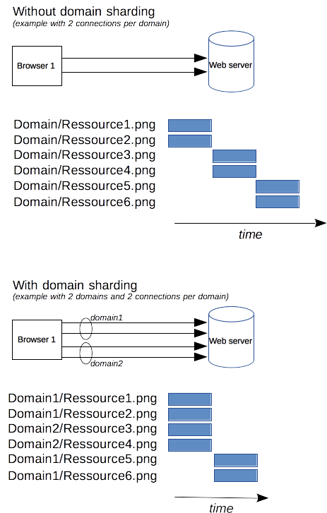 If the server wishes a faster Web site or application response, it is possible for the server to force the opening of more connections. For example, Instead of having all resources on the same domain, say www.example.com, it could split over several domains, www1.example.com, www2.example.com, www3.example.com. Each of these domains resolve to the same server, and the Web browser will open 6 connections to each (in our example, boosting the connections to 18). This technique is called domain sharding.