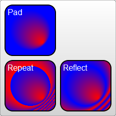Both linear and radial gradients also take a few other attributes to describe transformations they may undergo. The only other one I want to mention here is the spreadMethod attribute. This attribute controls what happens when the gradient reaches its end, but the object isn't filled yet. It can take on one of three values, "pad", "reflect", or "repeat". "Pad" is what you have seen so far. When the gradient reaches its end, the final offset color is used to fill the rest of the object. "reflect" causes the gradient to continue on, but reflected in reverse, starting with the color offset at 100% and moving back to the offset at 0%, and then back up again. "Repeat" also lets the gradient continue, but instead of going backwards, it just jumps back to the beginning and runs again.