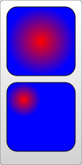 The stops used here are the same as before, but now the object will be red in the center, and in all directions gradually change to blue at the edge. Like linear gradients, the <radialGradient> node can take several attributes to describe its position and orientation. However, unlike linear gradients, it's a bit more complex. The radial gradient is again defined by two points, which determine where its edges are. The first of these defines a circle around which the gradient ends. It requires a center point, designated by the cx and cy attributes, and a radius, r. Setting these three attributes will allow you to move the gradient around and change its size, as shown in the second rect above.