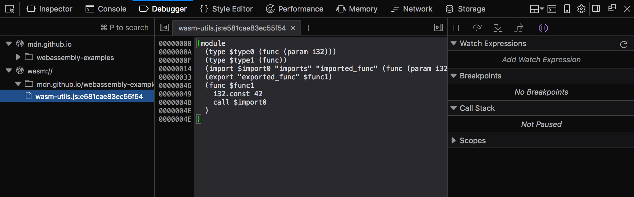 The net result of this is that we call our exported WebAssembly function exported_func, which in turn calls our imported JavaScript function imported_func, which logs the value provided inside the WebAssembly instance (42) to the console. If you save your example code now and load it a browser that supports WebAssembly, youâll see this in action!
